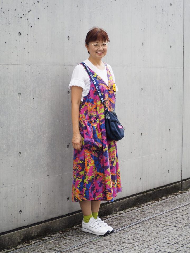 原宿や表参道で複数のギャラリーを経営している米原さんは、大のアート好き。この日は新しい展覧会の設営のため、動きやすくて気分も上がる「ヒステリックグラマー」のオールインワンをチョイス。ピンク、グリーン、パープルなど、色鮮やかなマーブル柄がお気に入りなのだとか。「TPOに合わせて洋服のテイストを変えますが、最近は派手な色を特に好むようになりました。その方が顔映りもいい気がするんですよね(笑)」