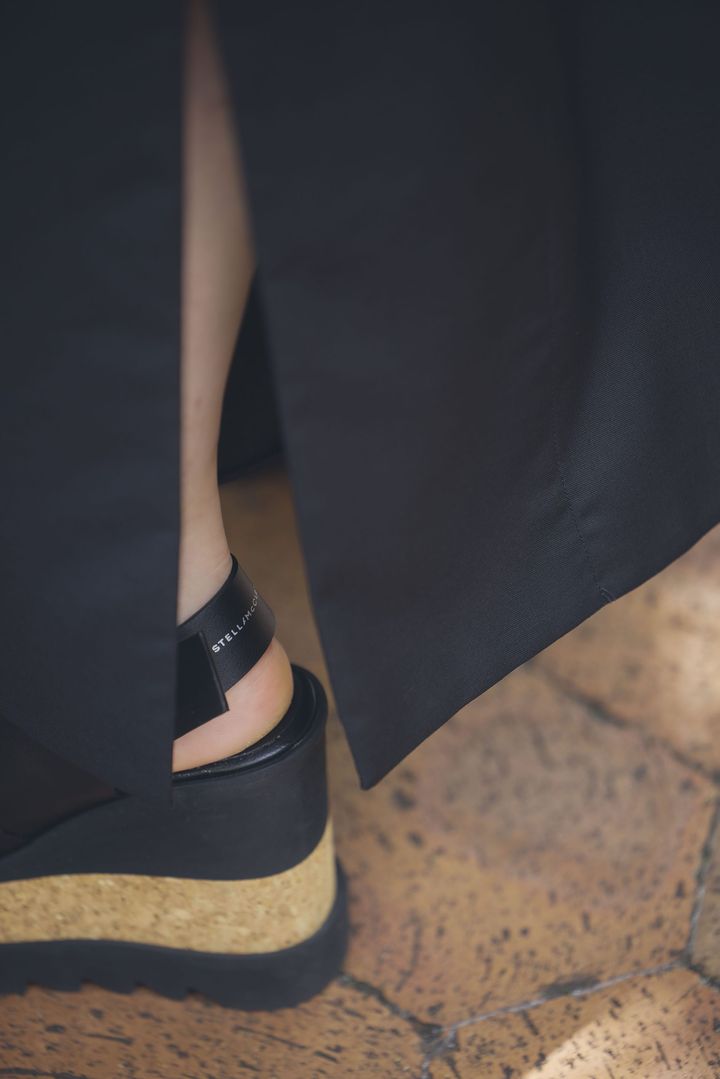 スカートのスリットシルエットをよりよく魅せるために、厚底サンダルでバランス調整します。