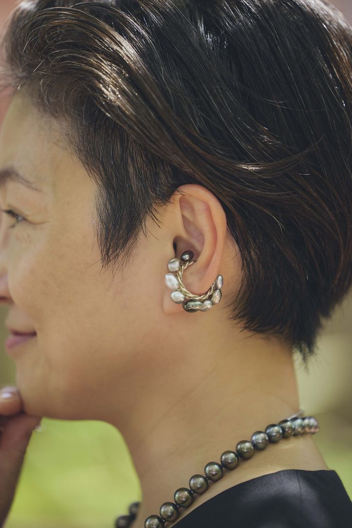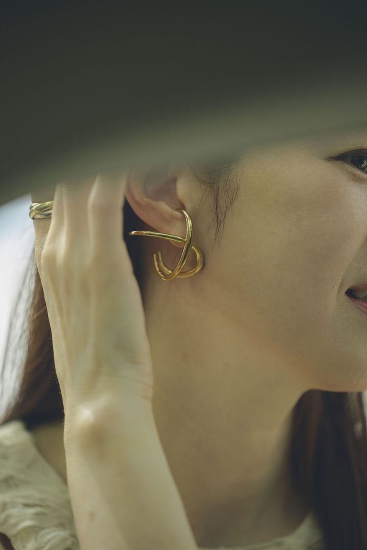 イヤカフにも見える存在感のあるピアスはanuansのもの。大ぶりのピアスは顔まわりを華やかに見せてくれるし、小顔効果もあり一石二鳥です。