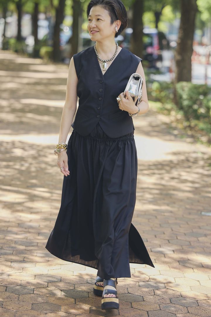 昔から黒は好きでしたが、年齢を重ねるたびにさらに黒率が高くなってきました。黒が増えることで素材や質の良いものを選ぶようになっています。デザインはシンプルから、甘め、モードまで幅広く収集中。このシンプルなベストと、スリットが入った質のいいスカートはThe Rowのもの。シンプルでも、素材とシルエットの良さで身体をきれいに見せてくれるところがお気に入りです。