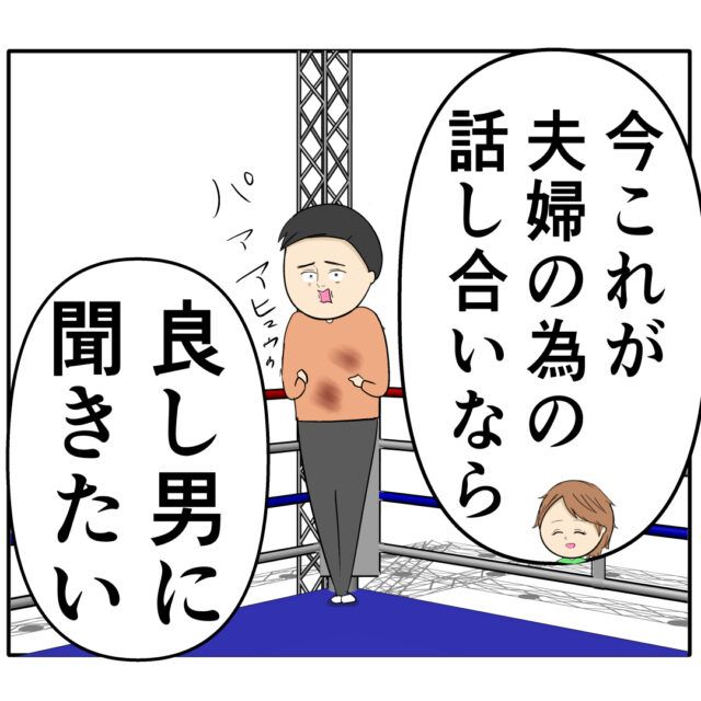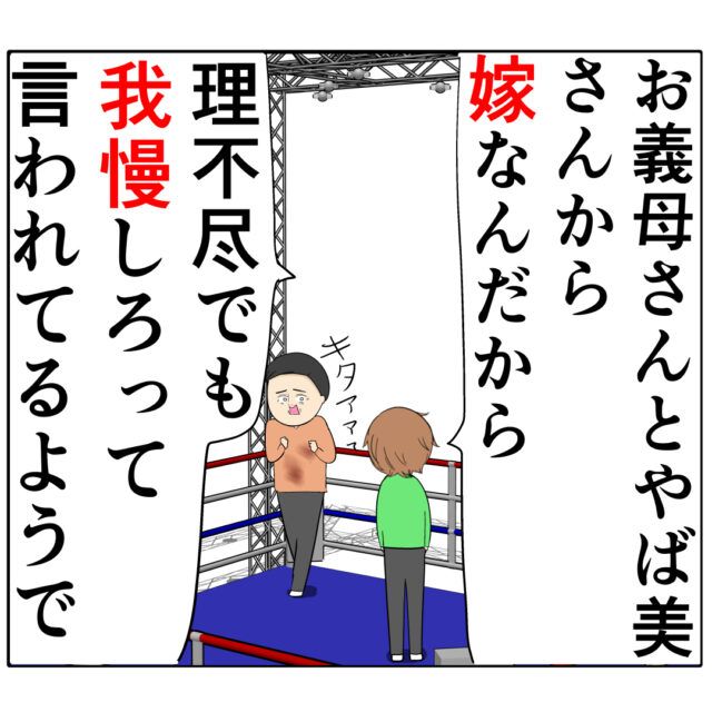 「お義母さんとやば美さんから、『嫁なんだから、理不尽でも我慢しろ』って言われてるようで」言葉を続けるすみれさんに、リングのコーナーまで追い詰められたように「キタアア・・(怖)」と声を出す良し男さん。