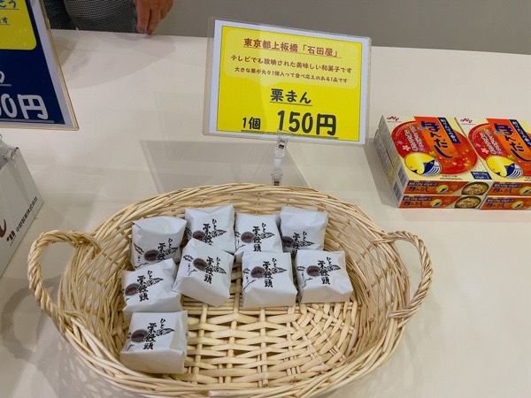 毎回、社長の石村さんが買いにいらっしゃるという、創業昭和25年、上板橋の老舗「石田屋さん」の数量限定どら焼きや栗饅頭も見逃せません。これを目当てに来られるお客様も多いようで、あっという間に完売。