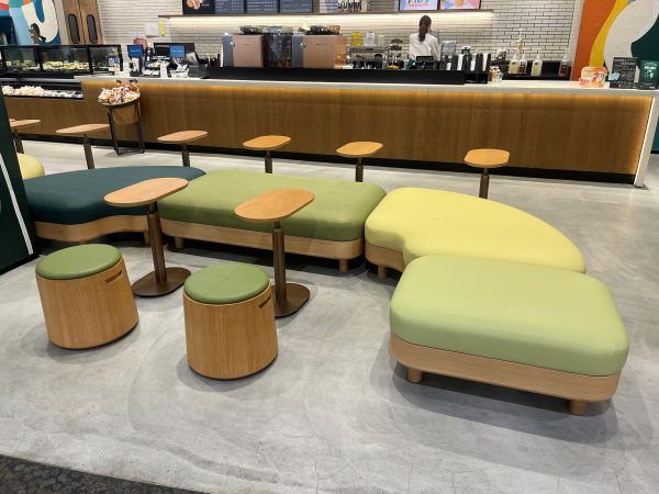 グリーンを基調としたシームレスな席が広がり、家族みんなで、お友だちと一緒に、座ってくつろげそうです。もちろん、席からの「モバイルオーダー&ペイ」(公式モバイルアプリなどから事前に注文・決済ができるサービス)も使えるので、席から注文し、レジに並ぶことなく商品を受け取ることもできますよ。
