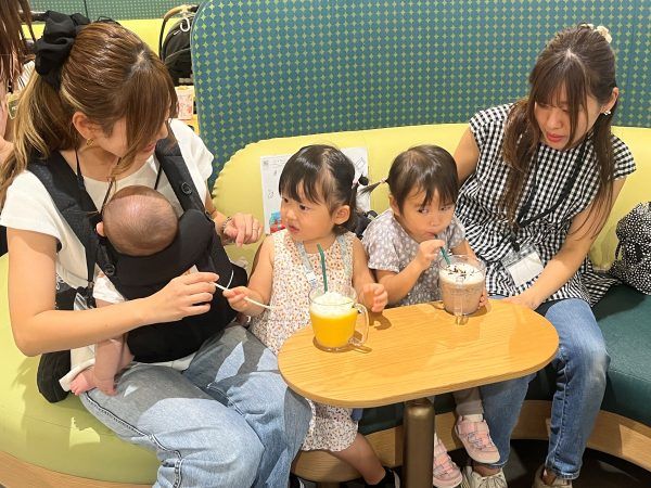 mori3階には、子ども向けのショップが多く並び、子ども連れがとても多いので、「スタバって、子どもと一緒でも過ごしやすい!」そんな体験ができるのではないかと期待が膨らみました。席を探してうろうろするのではなく、シームレスな席にみんなが並んで座る姿は、心温まりますね。