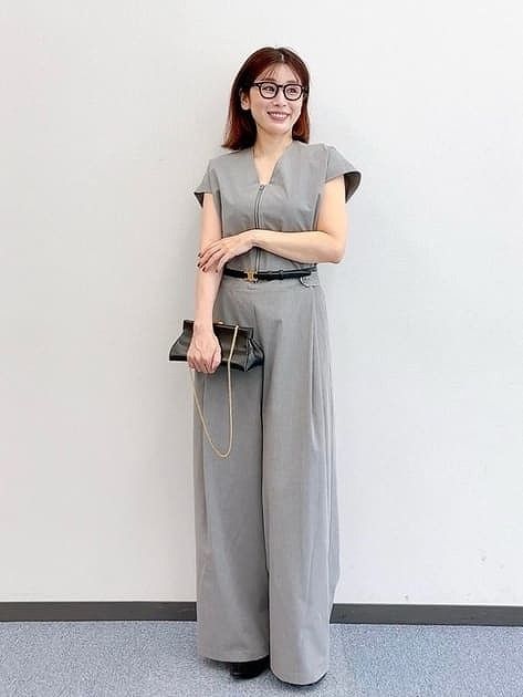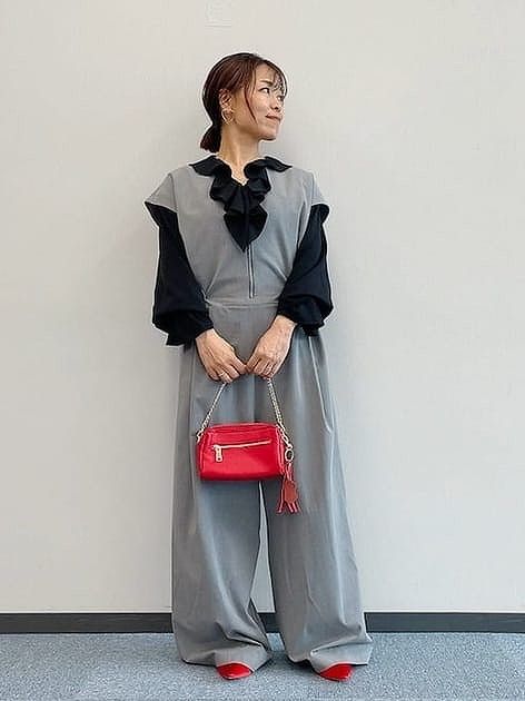 サラッとしていて落ち感のある素材。シンプルなオールインワンなので、合わせるアイテム次第でいろんなコーデが楽しめるオールインワンです。今回のようにフリルブラウスを合わせて甘ニッシュに仕上げるのもおすすめです。