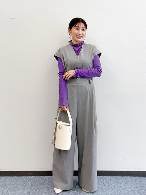 半袖&深めのVネックなので、シアータートルをインしてもサマになります。今回は鮮やかなパープルとグレーの色合わせでスタイリング。まだ暑い時期にはキャミソールなどを合わせて1枚で着てみてもアリ。