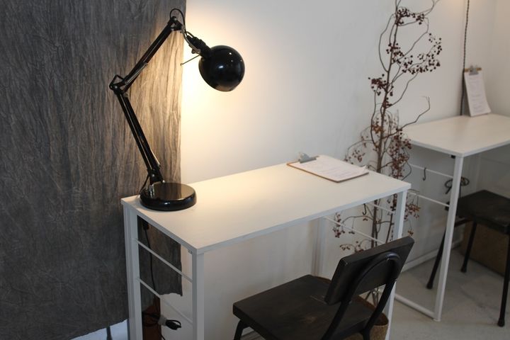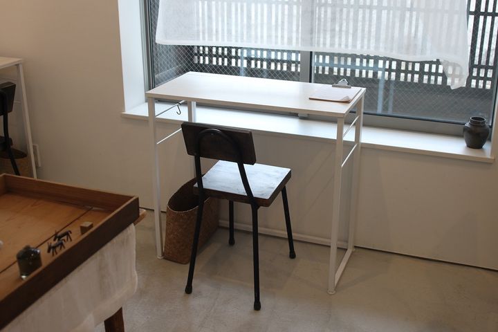 店主がペイントした白のデスクがとっても素敵なこちらは、一人用の座席。自分だけの座席という特別感があっていいですね。