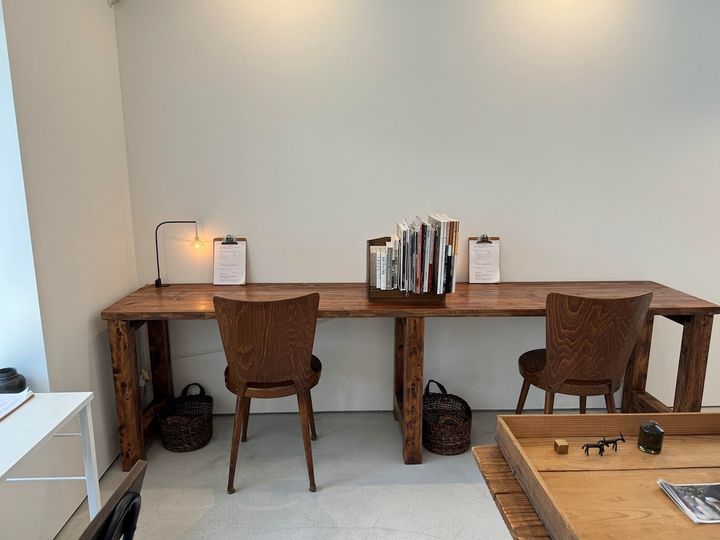 2席並んでいますが、スペースが広い上に間に並べられた本もゆるい仕切りのようで隣にお客さんがいても、ひとり時間に集中できます。手帳やノートを広げて書き物をするのにも◎。