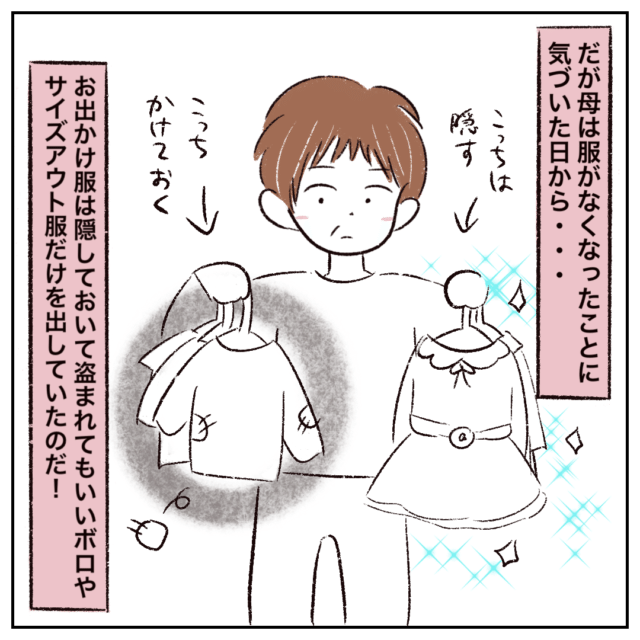 実は・・お母さんは、前に服がなくなったことに気づいたら日から、お出かけ服は隠しておいて、盗まれてもいいボロやサイズアウトした服だけをハンガーに掛けて出していたのでした。