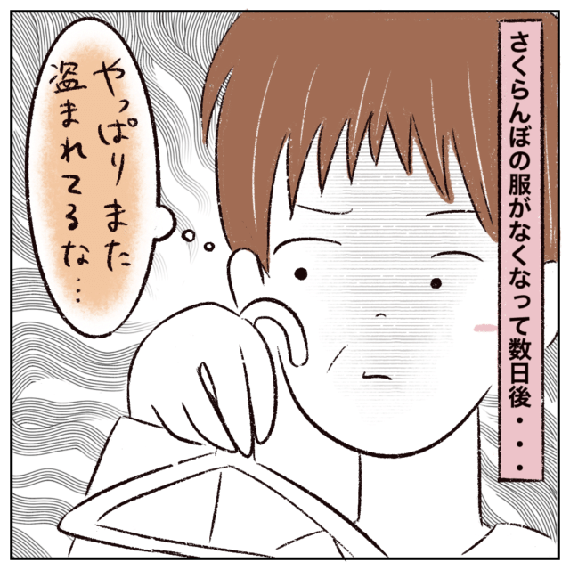 まるさんのさくらんぼの服がなくなって数日後のこと。「やっぱりまた盗まれてるな・・」空のハンガーを見つめて考え込むお母さん。
