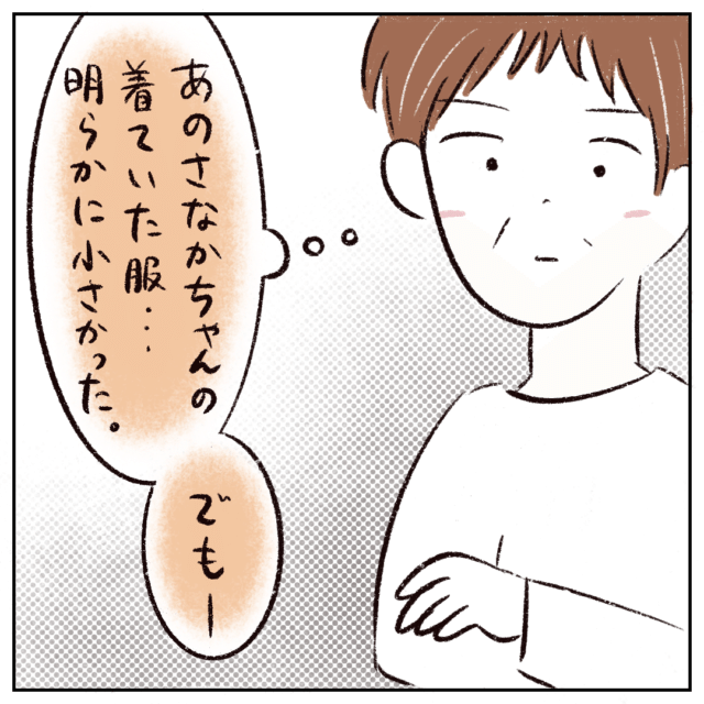 「あの時、さなかちゃんの着ていた服・・明らかに小さかった。でも・・」と考えるお母さん。
