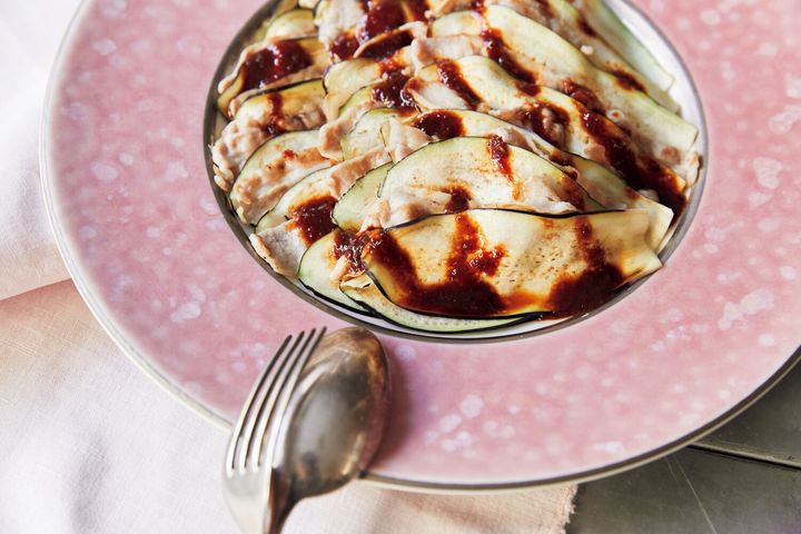 生のなすと豚バラ肉を重ねて、四川料理の前菜・雲白肉のように白い雲に見立ててもりつけ、にんにくがきいたオイスターだれをかけました。