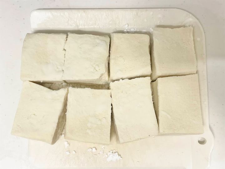 1. 高野豆腐を手で握り水気を絞ったら、高野豆腐を4等分ずつに切り分け、表面に片栗粉をまぶします。