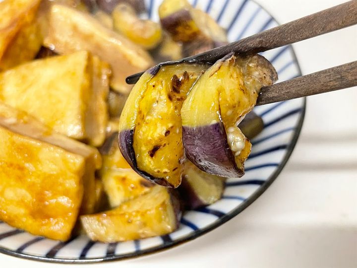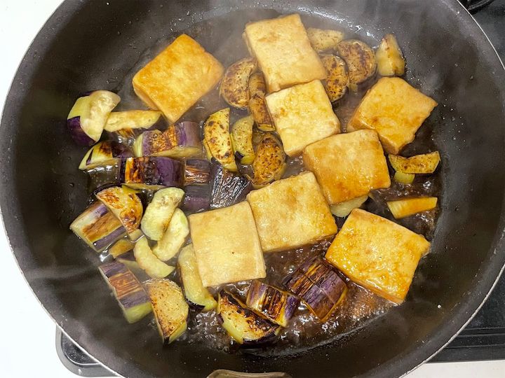 3. 茄子の炒め煮に「高野豆腐」を合わせるのは珍しい!もっちり食感がとろっとろのナスと好対称なの♡