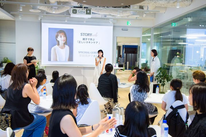 夏休み終盤の8月25日(日)、 ママも子どもも関心が高い「正しいスキンケア」をテーマに、STORY初となる親子イベントをスキンケアブランド「タカミ」のオフィスで開催しました。スキンケアブランド「タカミ」の教育チームが、美容皮膚の観点での正しい肌知識とスキンケア方法をクイズやアクティビティを交えて楽しくレクチャー。多くの方から質問があった「子どものスキンケアをいつからしていいの?」という内容もスッキリ解決できました。ゲストには2人のお子さんをもつタレントの安田美沙子さんをお迎えして、スキンケアについてのトークセッションも!気さくにお話をしてくれる安田美沙子さんに参加者全員メロメロでした。最後は、家族でお使いいただけるようにお土産としてタカミスキンピール2本をプレゼント。豪華なお土産と充実の内容に、大人だけでなく子どもも笑顔溢れるイベントとなりました。