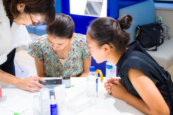 角質を育むために大切にしてもらいたいこと2つ目が「正しい肌代謝」。年代によって肌の代謝周期は変わるものの、どれだけ若くても夜更かしや睡眠不足が続いたり、食生活が乱れることでも代謝は乱れ、肌の生まれ変わりを遅くしてしまうのだそう。「ちゃんと寝てないかも…」「お菓子食べすぎかも…」と、はにかむお子さんもチラホラ…。安田さんはランニングで代謝が整うことを実感するとお話しされていました。アクティビティでは、角質チェッカーを使って参加者たちの肌の角質状態を実際に確認。自分の角質がどうなっているのか? 肌の生まれ変わり状態を可視化されることに、ドキドキの参加者でした。