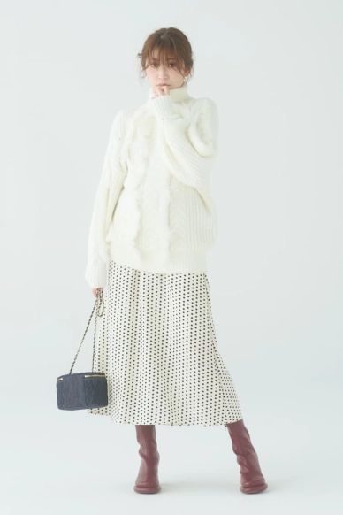 ニットとスカートを白でまとめた王道モテコーデ。ファーやドット柄で女のコらしさを演出♡ ゆったりとしたシルエットで、華奢見えも叶えてくれます。ボルドーのブーツを差し色にして。
