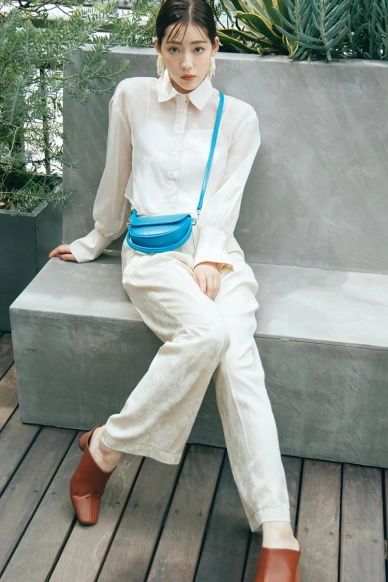 洗練されたホワイトのワントーンコーデ。シアー素材のシャツに花柄ジャガードパンツをあわせて、のっぺりした印象を回避!ブルーバッグを差し色にして♡