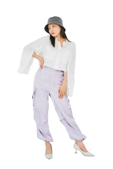 メンズライクなカーゴパンツを使ったコーデ。パープルを選べば女性らしく着こなせます。ショート丈のシャツをあわせてスタイルアップを狙って!足元はパンプスを選んで、洗練されたスポーティMIXコーデに♡