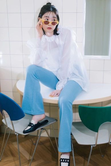 春らしいブラウスを使ったコーデ。ビッグサイズを選ぶことで体型カバーを叶えてくれる!ブルーのパンツをあわせて爽やかにまとめて♡