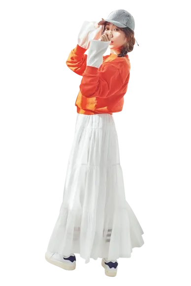 視線を集めるオレンジのスエットを使ったコーデ。白のニットをレイヤードして、コーデに統一感を♡ スカートは女の子らしいチュールスカートをチョイス。カジュアルな小物あわせでこなれた印象に!