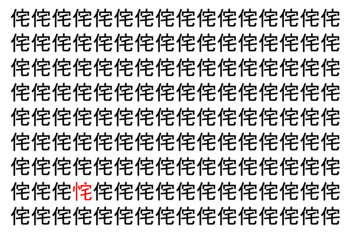 画像の中には、「侘」という漢字が縦に9行、横に16個並んでいます。 全部で144個となりますが・・・、そのうち1つは「異なる漢字」となってますよ!!