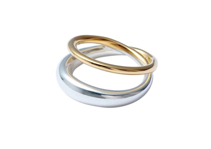 上下逆でつけると、また違った雰囲気に。クロスリング(SV925×K18GP)¥19,800/TEN.