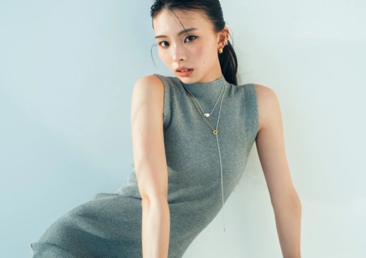 ラリエットネックレス(K18GP×SV925)¥34,100、シルバーネックレス(SV925)¥24,200、ゴールドイヤカフ(SV925/K18GP)¥13,200、シルバーイヤカフ(SV925)¥12,100、ゴールドイヤリング(SV925/K18GP)¥18,150/以上TEN. ノースリーブニットワンピース(チュールキャミセット)¥18,920/SNIDEL ルミネ新宿2店