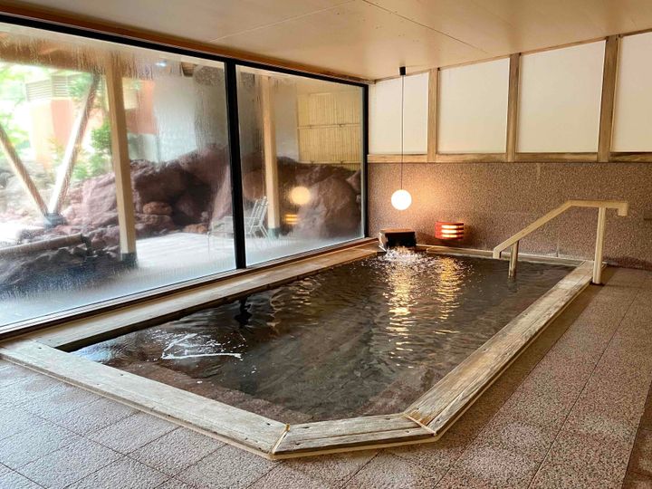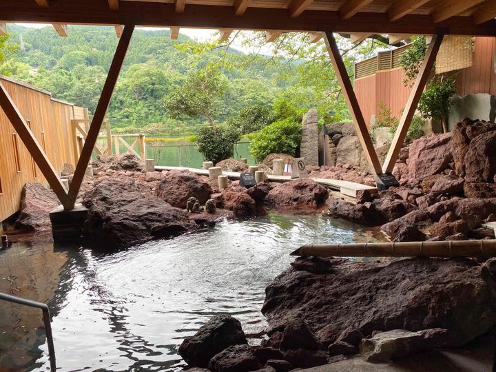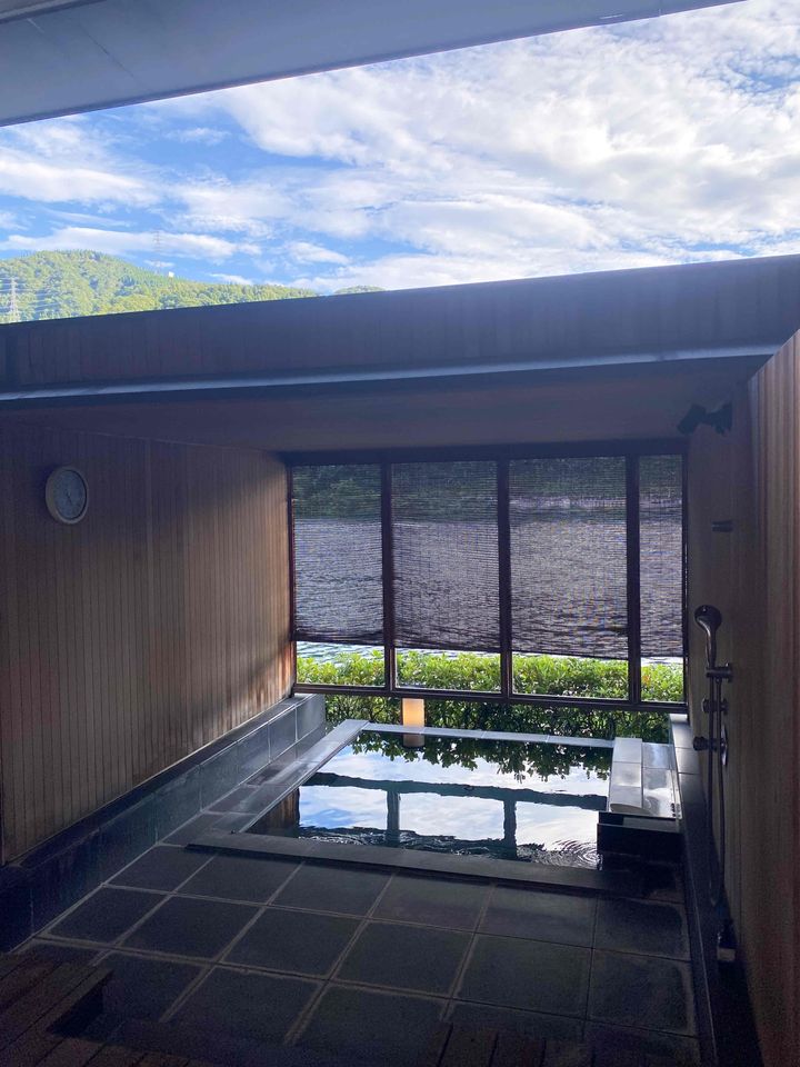 大浴場の露天風呂では、自然の力と赤石の設えからエネルギーを感じるひとときを。窓の外には富山の美しい自然が広がり、川のせせらぎが静かに響く中、ゆったりとくつろげました。