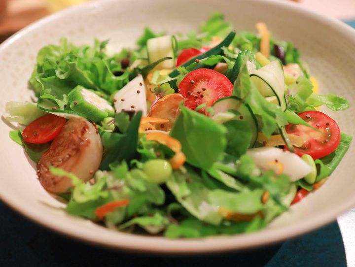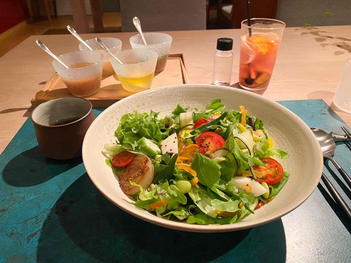 スパ体験の締めくくりに、リバーリトリート雅樂倶1階カフェにて「パワーサラダ」をいただきました。自社農園で朝採れした新鮮な野菜や地元産の野菜をふんだんに使用し、4種類のドレッシングで楽しむボリューミーサラダは、野菜の鮮やかさと際立つみずみずしさが食欲をそそります。食べ応え抜群のサラダを完食する頃には、内面まで磨かれた気分に。