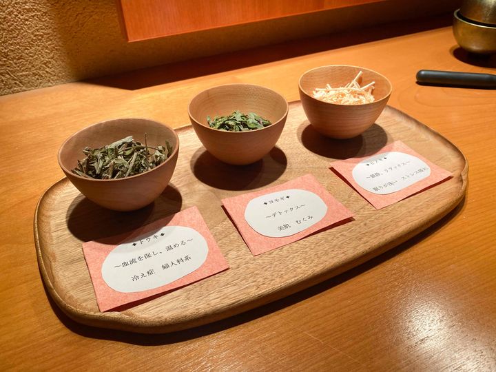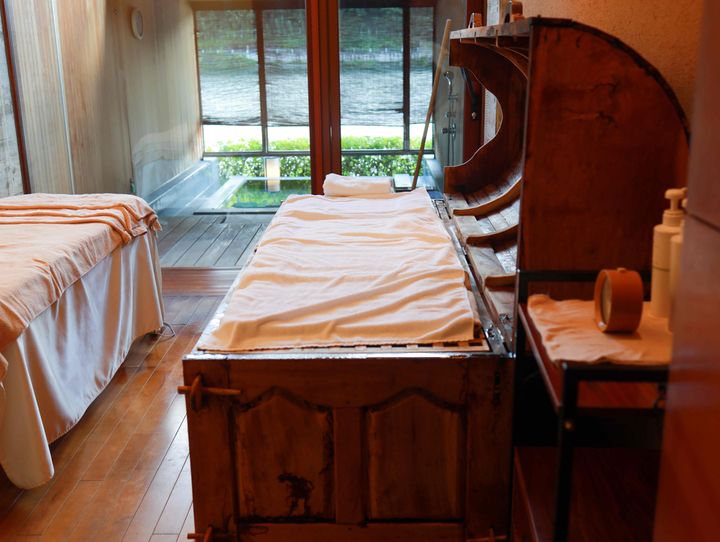 まずは丁寧なカウンセリングを受け、着替えを済ませたら、木製の大きな箱の中に入りる薬草蒸を体験。富山県産のヨモギ、トウキ、ヒノキから、体調に応じた薬草を選べ、富山の魅力に触れられる点もポイントです。20分後には汗が吹き出し、はじめのデトックスが完了します。