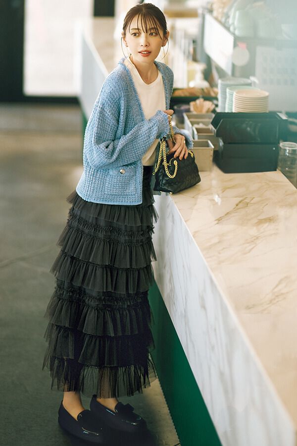 ツイードニットジャケット¥22,000/マイストラーダ Tシャツ¥4,200/Olu. スカート¥15,400/31 Sons de mode(ヒロタ) バッグ¥15,400/ダイアナ(ダイアナ 銀座本店) イヤリング¥3,850/ハクフルール、リング[右手]¥16,500/masae(ともにロードス) ダブルフィンガーリング[左手]¥37,400/モニス(14 SHOWROOM) ローファー¥23,100/OHGA