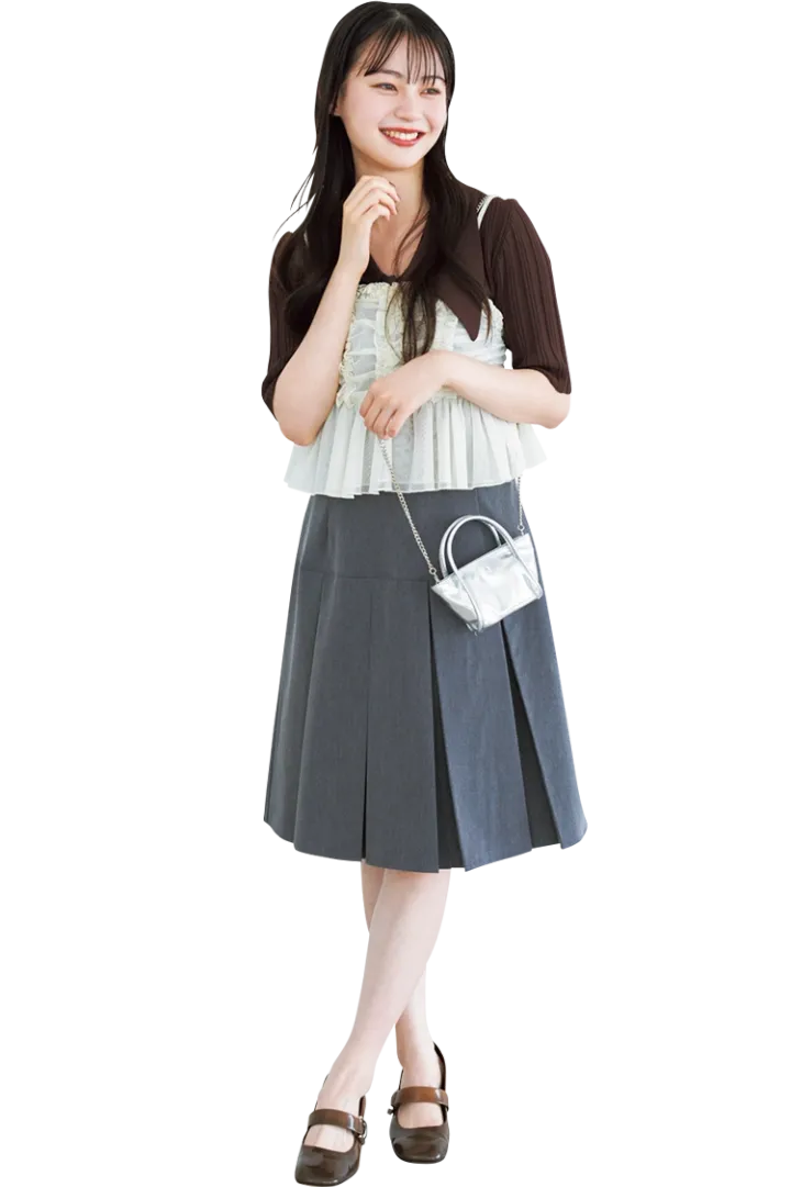 チュールキャミ×プリーツスカートの組みあわせで甘く仕上げる♡ ブラウンのパンプスでコーデに統一感を与える。
