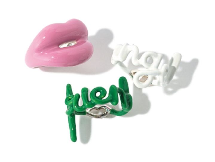 エナメル特有のリキッドな光沢感が、手元にフレッシュな存在感をプラス。リング、リップ¥53,900 FRIEND、ANGEL各¥47,300(ホットリップス/トゥモローランド TEL:0120・983・511)