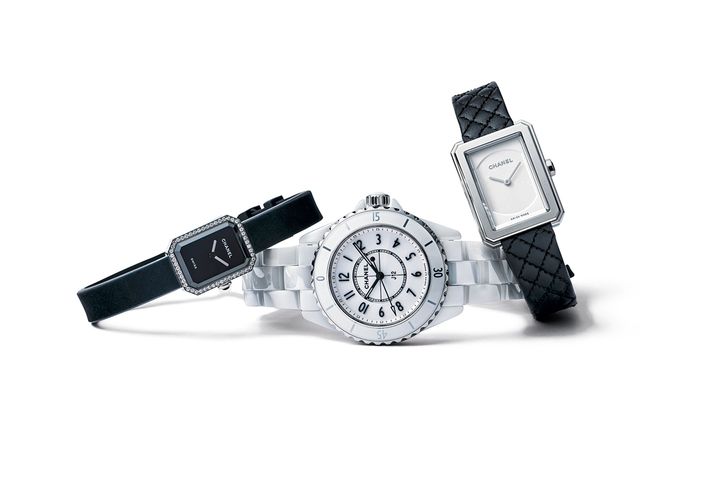右_時計「ボーイフレンド」〈SS×カーフスキンストラップ ケース 27.9×21.5㎜ クォーツ〉¥665,500 中_2000年の初登場で話題をさらったスポーティなセラミックウォッチが、「何も変えずに、すべてを変える」をモットーに、誕生20周年を迎えた2020年にリニューアル。ディテールを細かく見直し、ミリ単位での修正を加え、より洗練され現代的な表情に。時計「J12」〈SS×高耐性ホワイトセラミック ケース33㎜ クォーツ〉¥841,500 左_1987年に登場したシャネル初の腕時計「プルミエール」の系譜を継ぐ、最新ミニウォッチ。きらめくダイヤモンドに縁取られたケースはステンレススチール製。気取らず、自分らしく、デイリーにもドレスアップにも…理想が詰まったとっておき。時計「プルミエール リボン」〈SS×D×ヴェルヴェットタッチ ブラックラバーストラップ ケース 19.7×15.2㎜ クォーツ〉¥896,500(すべてシャネル)