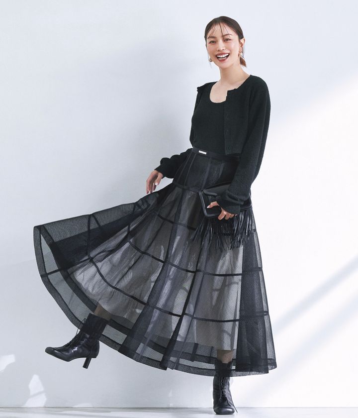 暑さの残る初秋の黒コーデはデコルテの抜け感とふんわりスカートで軽やかに。メッシュ素材のデザインスカートはチュールのような甘さもありながらモードが香る一枚。ショート丈カーデとブーツでバランスよく着こなして。