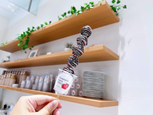 もう衝撃です!フルーツ飴は飴コーティング部分が分厚くてガリっと硬いイメージでしたが、「ICHICO」のいちご飴は飴が薄くパキパキとすぐに口の中で噛み砕くことができました。そして中から出てきたいちごはとってもジューシー! いちごも一口サイズで食べやすく、串にカップもついてるのでチョコソースが垂れて汚れる心配もありません。