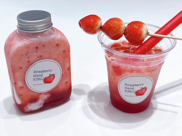 「いちごあめソーダ」にはいちごの果肉がたっぷり入っています。ノーマルいちご飴もやはり美しいですね。そして「いちごミルク」のボトルはなんと特注で、キャップをつけて持ち帰りやすくなっています。どちらも程よい甘さで、いちごの味をしっかり感じることができました!