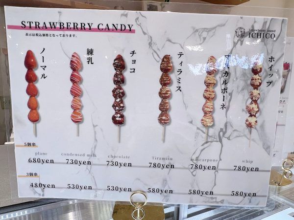 いちご飴のメニューは種類豊富で、ノーマルやトッピングしたもの合わせて6種類。量も3粒か5粒どちらか選べますよ。