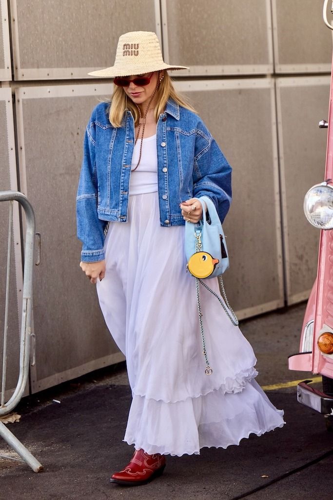 ドリーミーなマキシワンピに重厚感のあるウエスタンブーツで甘辛ミックスを楽しんでいたのは、スタイリストでクリエイティブコンサルタントのソニア・ライソン。マンネリしやすいワンピ × デニムジャケットですが、Y2K香るウエスタンブーツを合わせることで捻りのある旬なスタイリングに。白のマキシスカートから覗く赤ブーツのコントラストもこなれ感も演出してくれます。
