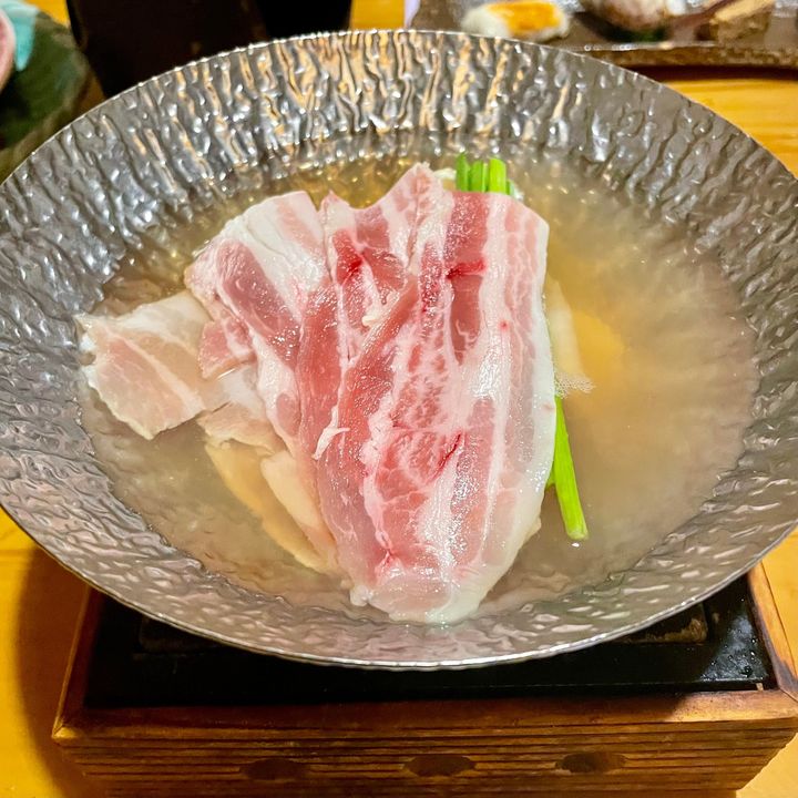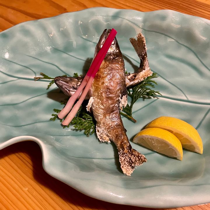 山女魚(ヤマメ)の塩焼き、馬刺し、もち豚鍋をはじめとした熊本の名産を使った料理、