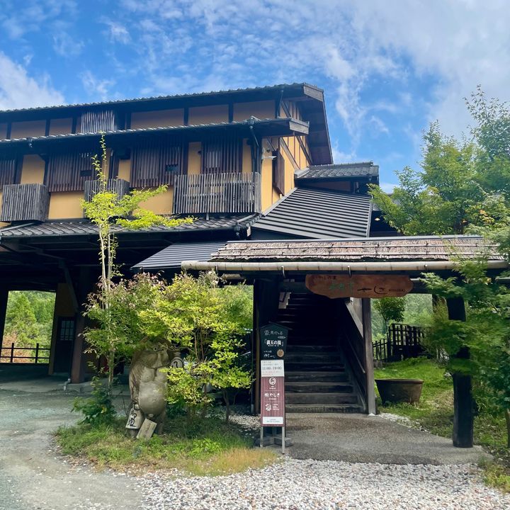 山々の細道を通り抜けた先に見える温泉宿『いやしの里 樹やしき』