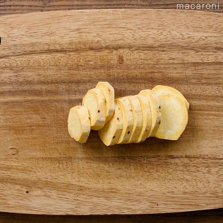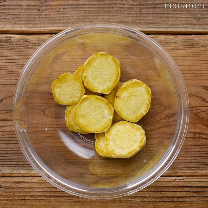 1: さつまいもの皮をむき、1cm幅の半月切りにして、水にさらして水気を軽く切ります。