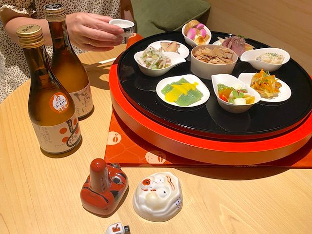 高知の郷土料理をアレンジしたおつまみ(複数皿)、ご近所の酒屋さんがセレクトした地酒(二合瓶・2本)、べく杯、風呂敷がセットになっていて、1セット2人前 4,800円(税込)はお値打ち!! べく杯と風呂敷はお持ち帰りできます。