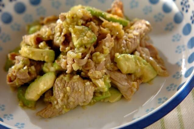 みじん切りにした白ネギに、砂糖、塩、酢、しょうゆなどを合わせた万能ネギだれで豚しゃぶ肉とアボカドを和えました。シャキシャキとしたねぎ塩ダレに、豚しゃぶとねっとり濃厚なアボカドがよく合います。