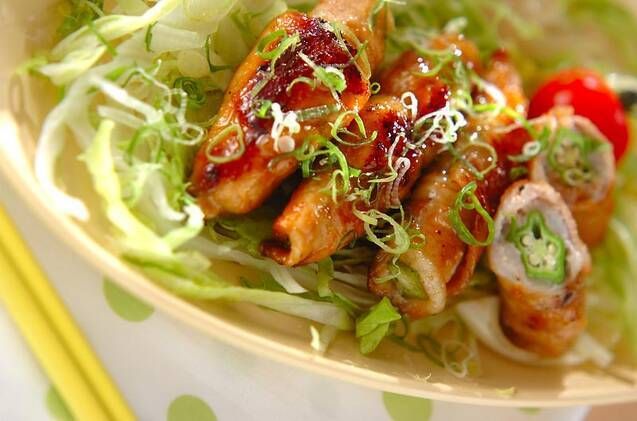 滋養強壮に効果的で、栄養価が高い夏が旬のオクラを豚しゃぶ肉で巻いた一品は、食べた瞬間、サクッ、ネバっとするオクラの食感がおもしろい! お弁当に入れても良いですね。
