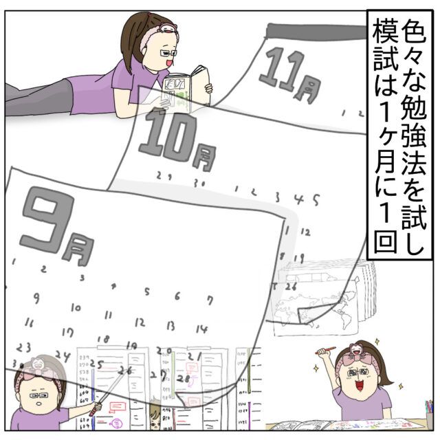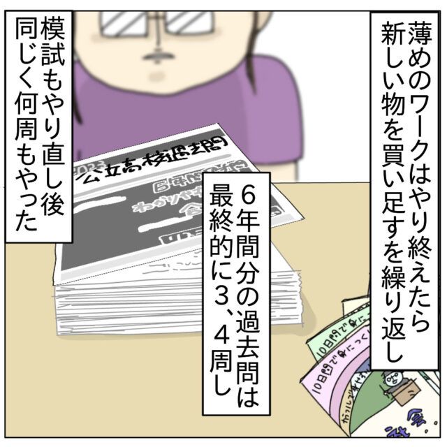 勉強が嫌いで苦手な中学3年生の長女リコちゃん。9月に初めて受けた模擬試験で志望校の桃栗高校がD判定だったためリコちゃんも両親も焦ります。親子で試行錯誤しながら色々な問題集や勉強方法を試し、リコちゃんには薄くてカラフルなものやスマホのアプリを使うものが合っていることがわかりました。地理では白地図に要点を書き込んだり、歴史では自分で年表を作ったりもしました。11月末の志望校決定の面談までに、自信を持って第一志望桃栗高校と書けるところまで学力を上げる事を目指します。