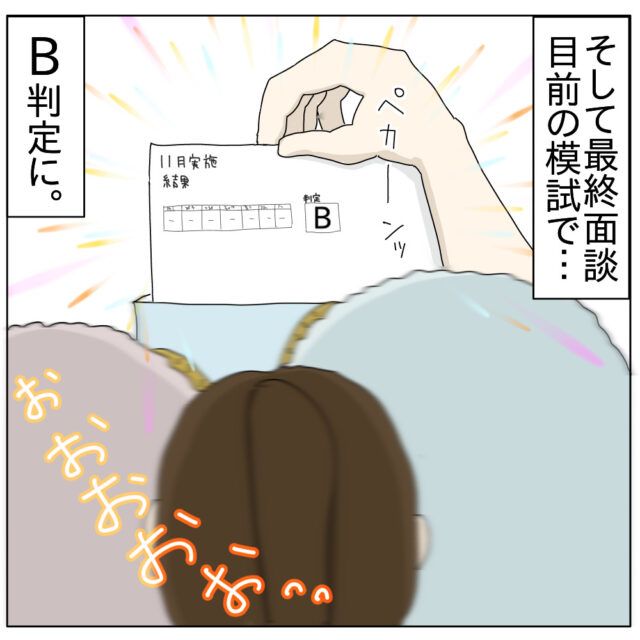 すごい!リコちゃんの頑張りと家族のサポートでB判定になりましたね!この調子でいきたいところですが、チャーさんの質問に先生は何と答えたのでしょうか?
