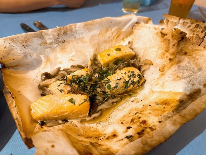 (例:タスマニアサーモンの紙包み焼 ※季節または入荷材料により予告なく変わる可能性がございます。)