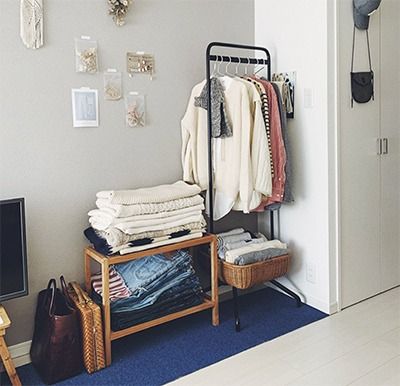 「ボリュームのあるものは、HAYで購入した大きな布バッグにIN。ニットを着ない時季には布バッグもたたんで保管できるので、場所をとらずに済むのが気に入っています。シーズンオフにはクローゼットの上の棚に移動」(sakiさん・会社員)